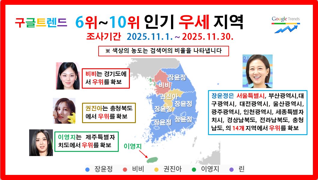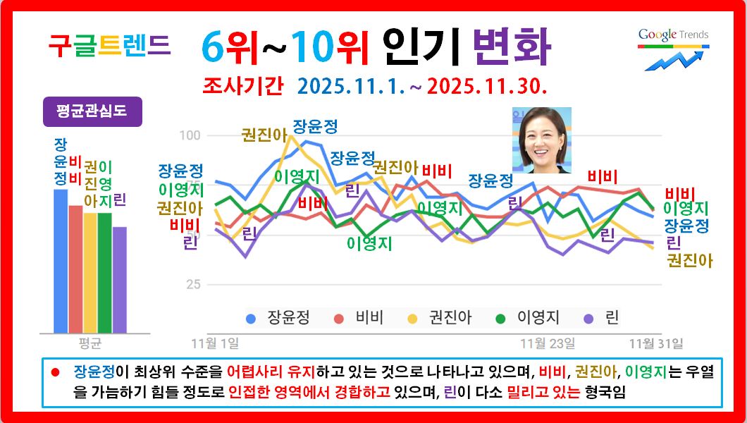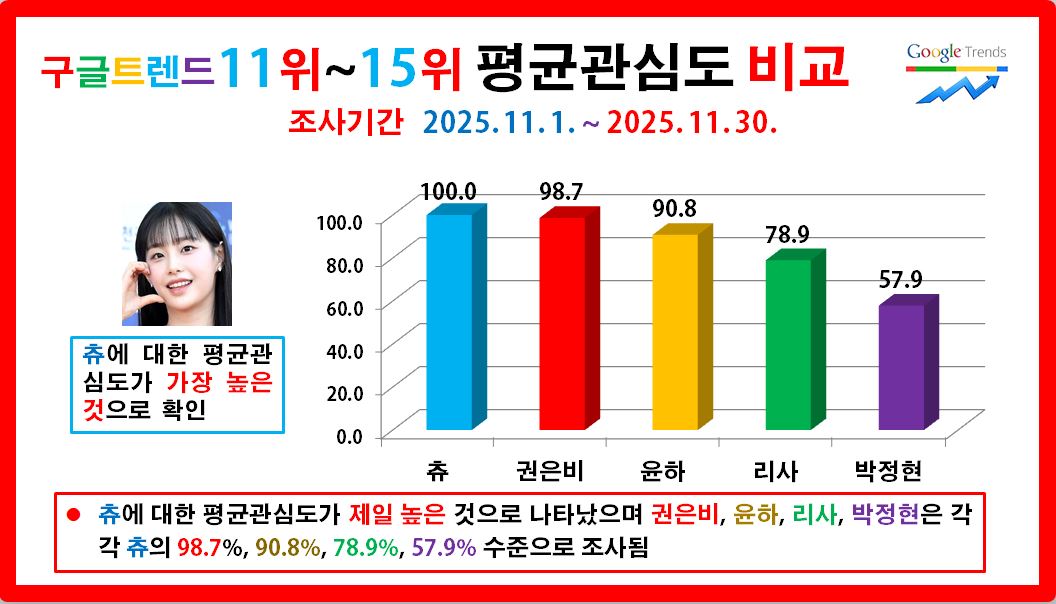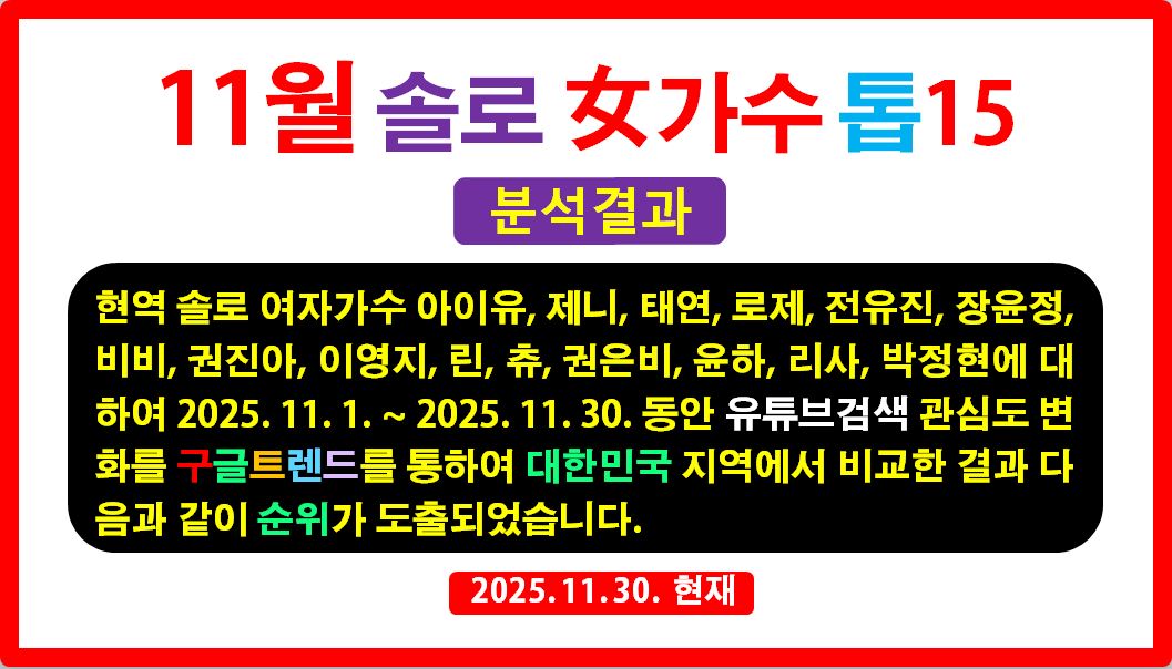 현역 솔로 여자가수 중 구글트렌드 상위 15명을 선정하고 이들에 대한 2025. 11. 1. ~ 11. 30. 동안 인기 변화를 누구나 쉽게 검증할 수 있는 구글트렌드 유튜브검색 데이터만을 사용하여 객관적으로 분석하였습니다.