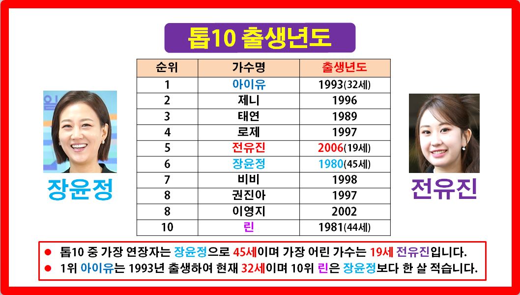 이번에 동일한 조건으로 검토된 솔로 여자 가수들은 아이유, 제니, 전유진, 태연, 로제, 장윤정, 비비, 권진아, 이영지, 린, 츄, 권은비, 윤하, 리사, 박정현, 홍진영, 송가인, 정서주, 빈예서, 김소연, 홍지윤, 백지영, 백예린, 최예나, 정은지 등입니다.